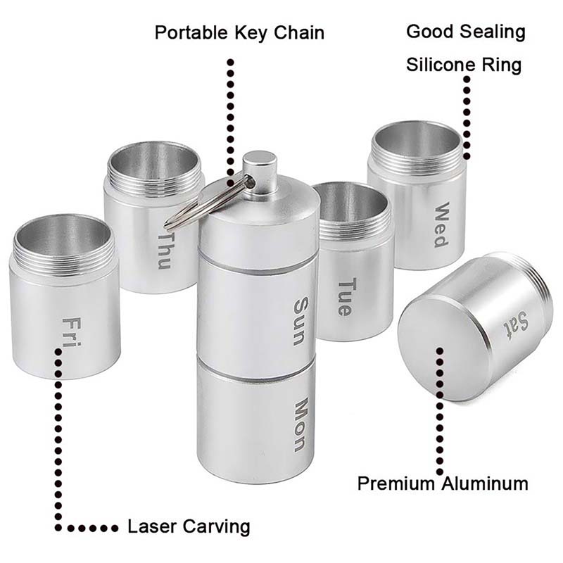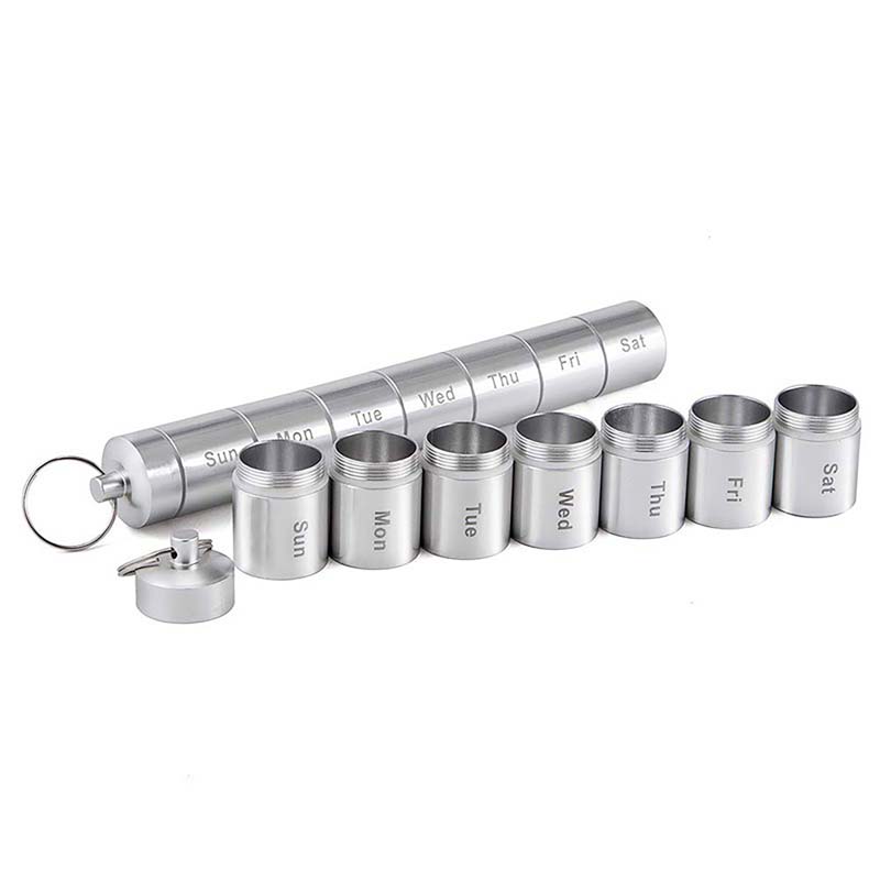 This pill box is made of aluminum. Equipped with mountaineering buckle. Compact shape, easy to carry, strongly waterproof, fashionable transparent design and humane segmentation design. Protect your privacy. Support customized logo. International freight may vary, please confirm the price before placing an order.